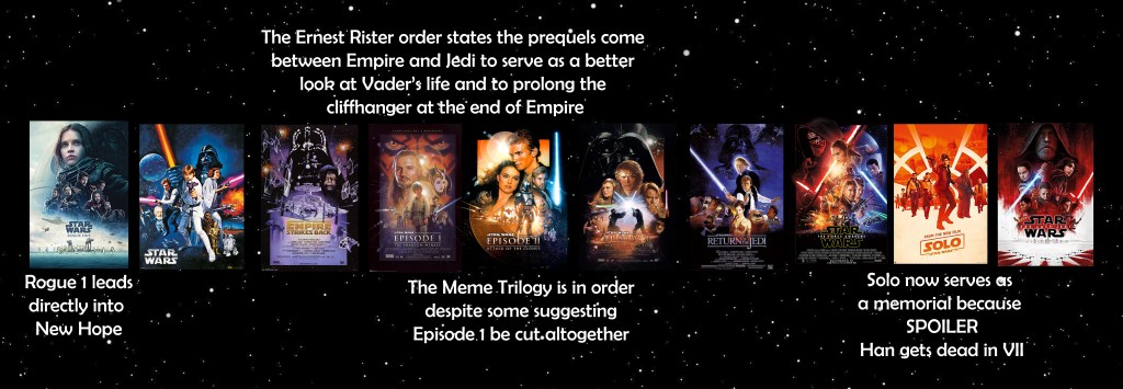 Second, my watching order. I’ve thought about this for a while and am going with a modified version of the Ernest Rister order. I may have lost some of you already but let me break it down with a picture to explain who the heck an Ernest Rister is and why I’m following him.