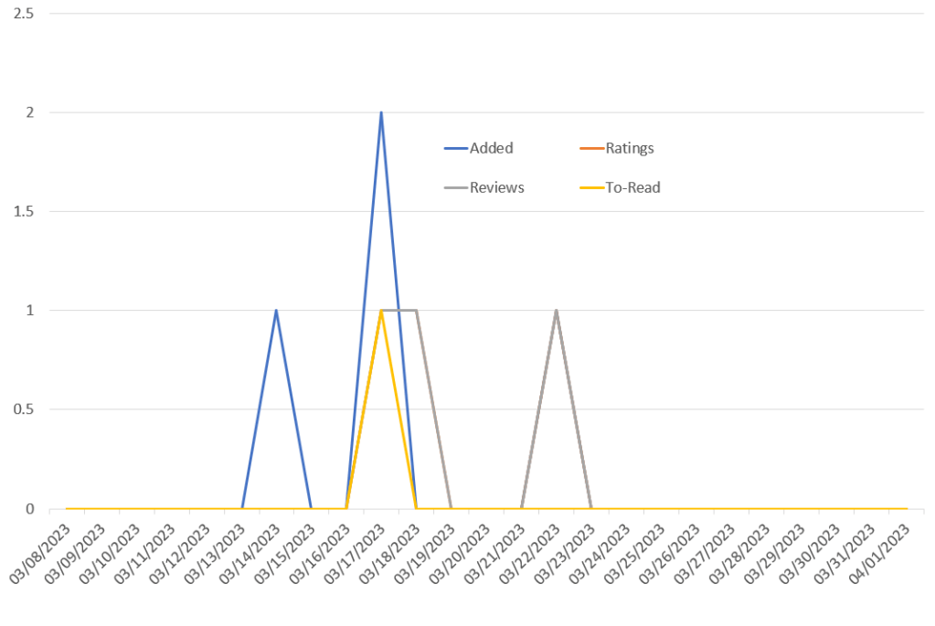 Oof. Things are pretty much back to normal. Not a lot of people added the book and no there were no reviews beyond the two that were generated by the campaign. So, as far as GoodReads is concerned, I have paid $215 for 7 people to add the book, 3 people to rate it, and 2 people to write fantastic reviews. Not exactly a return on investment. Still, I’m going to convert those numbers into some highly speculative financials.