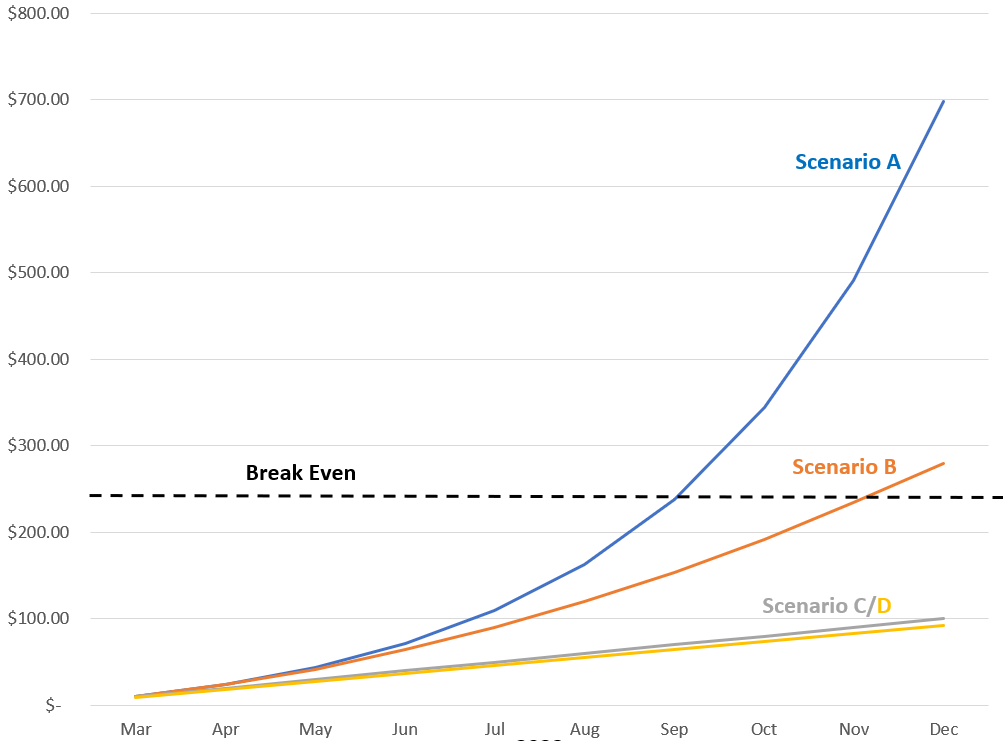 If we assume this logic is correct and holds, Scenarios A/B Both break even in 2023, which by all measures would be considered a success to me. However, I think we all know exponential growth is unlikely, so we should probably kill the pipe dream of Scenario A in a fire.