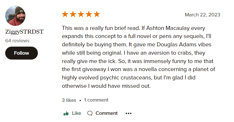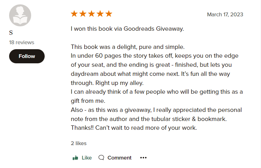 Ok, so two reviews so far, and both were 5-star ratings. That’s good press! It is worth noting that both of these reviewers have a much more reasonable number of ‘to-read’ books on their pages (~400 vs 40,000 on some of the winners). Still, their kind words and appreciation were enough to buoy my spirits, and I can post them everywhere.