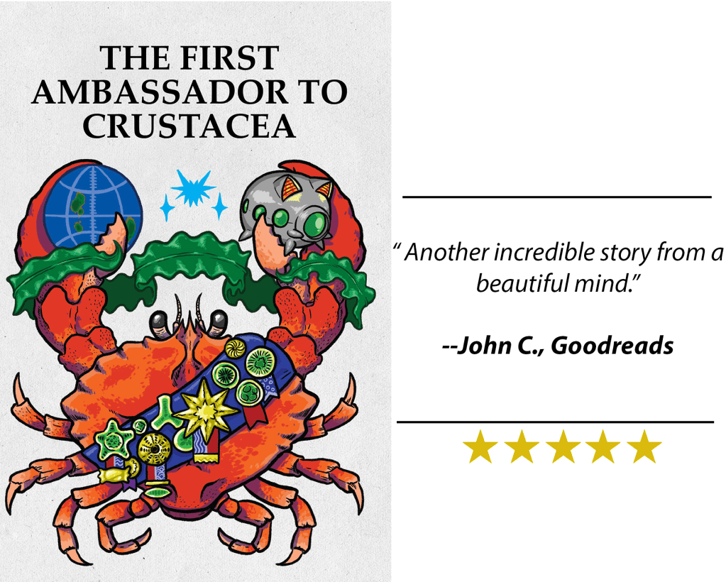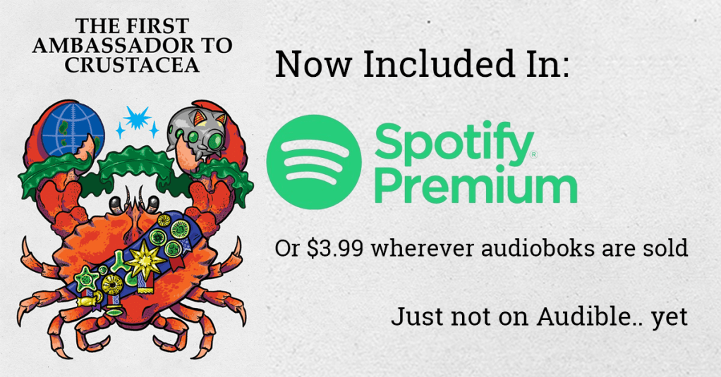 I’m thrilled to share that my latest audiobook, “The First Ambassador to Crustacea,” a crab-infused science fiction novella, is now available for your listening pleasure! Narrated by the talented Joel Simler, this captivating two-hour adventure takes you to the depths of an ocean planet dominated by lobsters.